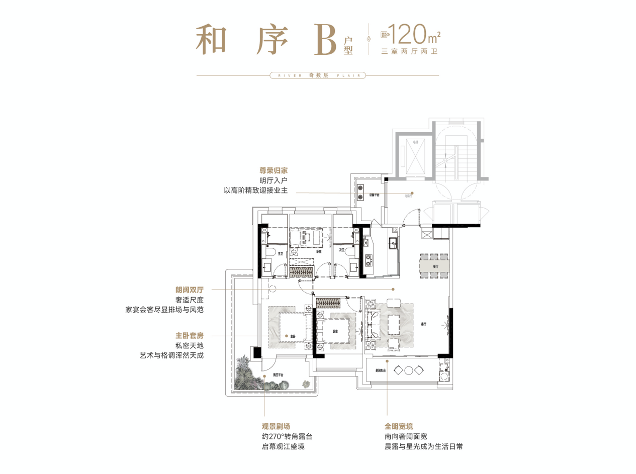 南向主卧星级套房,主卧双面采光与270°露台无界相连;