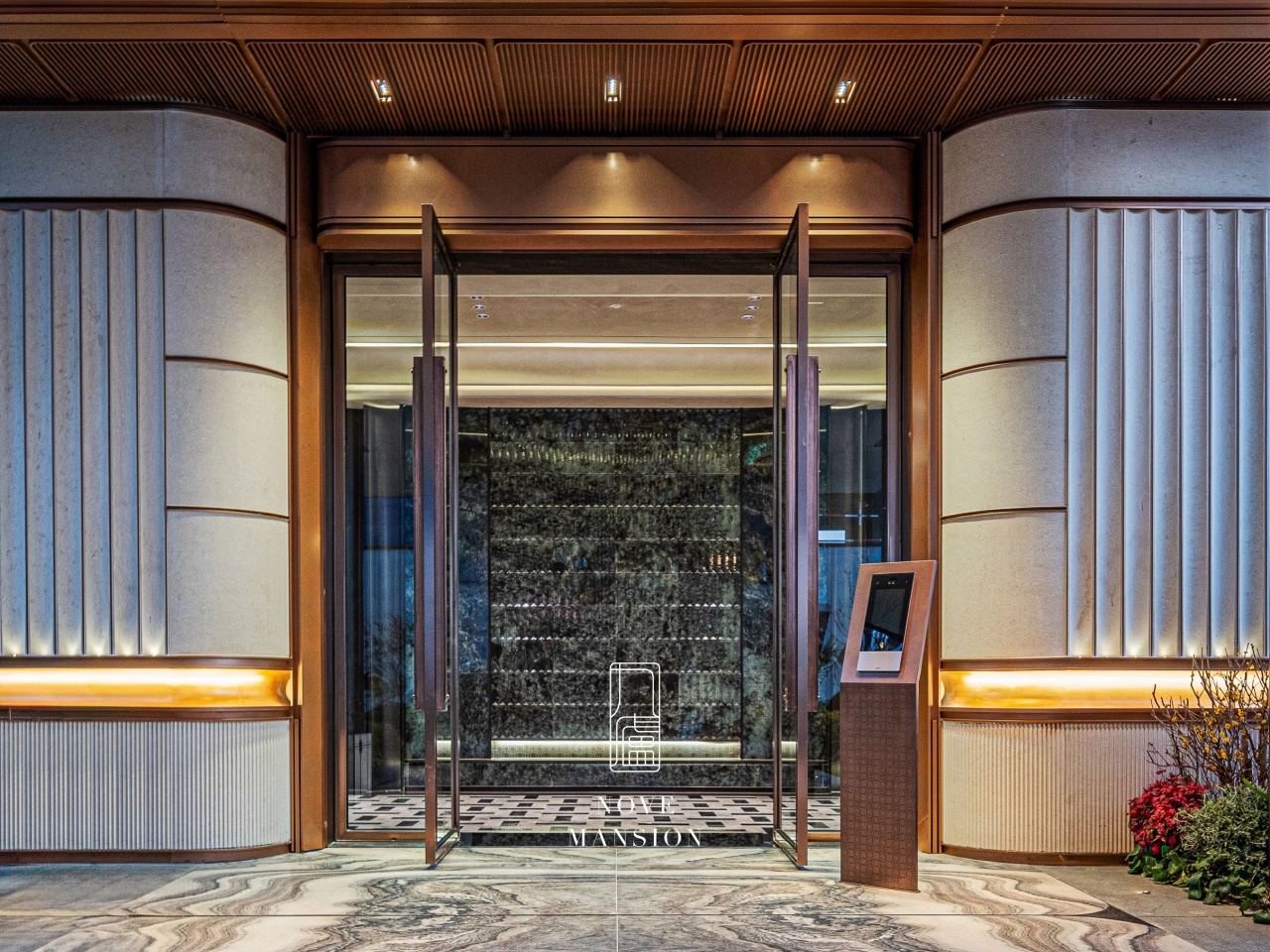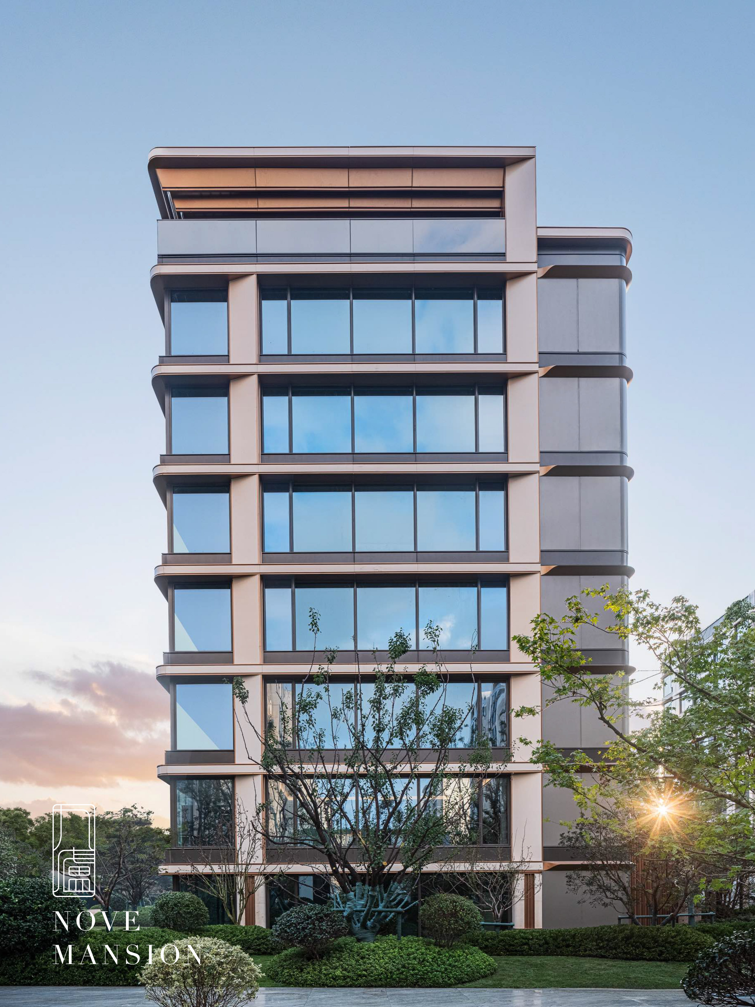 立面基座部分采用天然奢石,塔身采用精致的新工艺仿石铝板,暖色全金属铝板组成塔冠。大面积运用线条、弧线、斜切等元素,繁复工艺严苛定制。