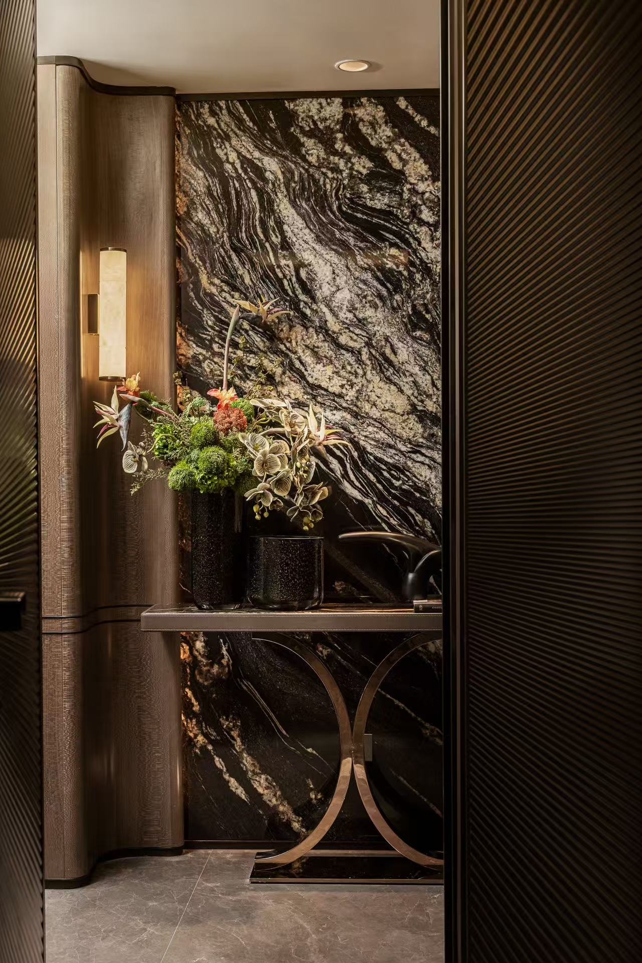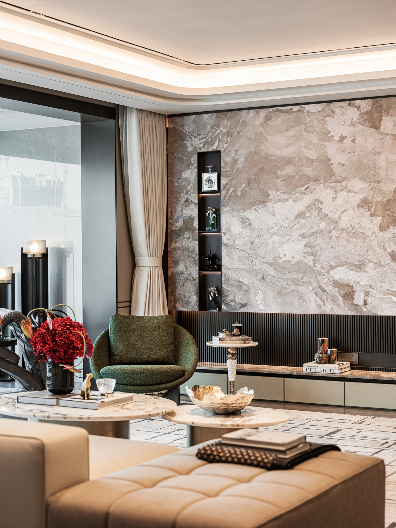 精心打造的天花板饰以米色肌理漆,其纹理仿若天成,细腻入微。地拼采用两种石材拼花铺设,构成精致且富有秩序感的几何图案,令人眼前一亮。