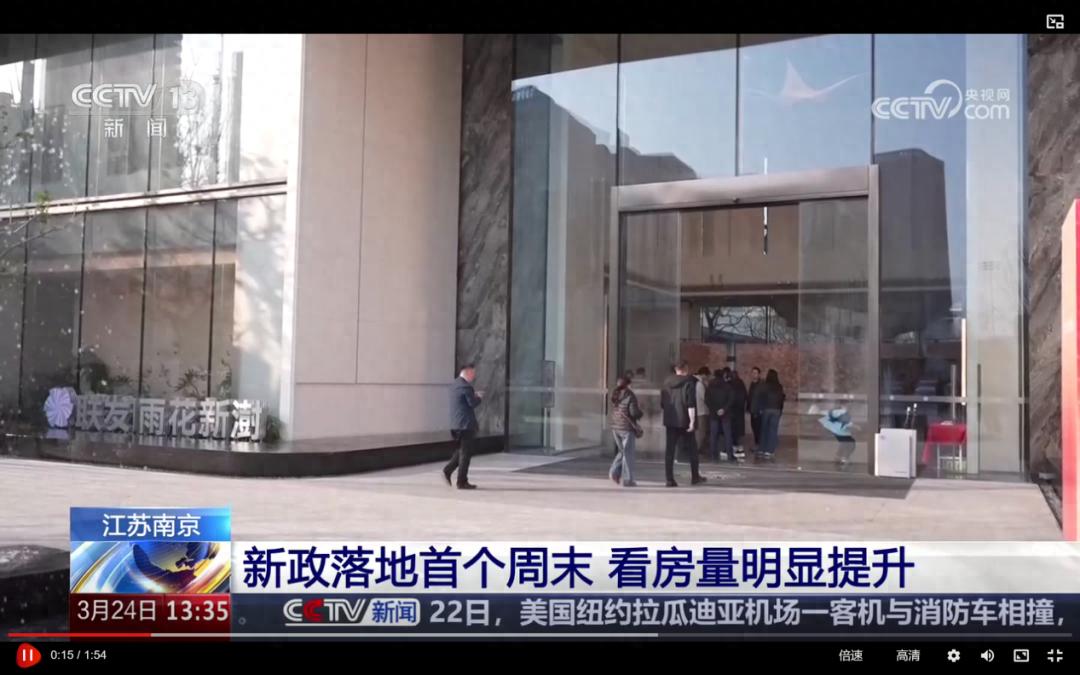 3月23日,CCTV财经频道《天下财经》播出《江苏南京:楼市新政落地实施 看房量明显提升》新闻,首个出镜项目即为联发雨花新澍,镜头下售楼处人流如织,置业热情高涨。