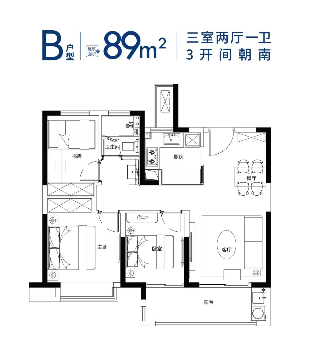 建面约89㎡户型,三室两厅一卫设计,入户独立三段式玄关柜,满足日常置物需求;餐客一体化设计,搭配U型厨房充分利用每一寸空间;南向长阳台,连通次卧,主卧设置有270°转角飘窗;三段式卫生间,干湿分离,也更方便整洁。